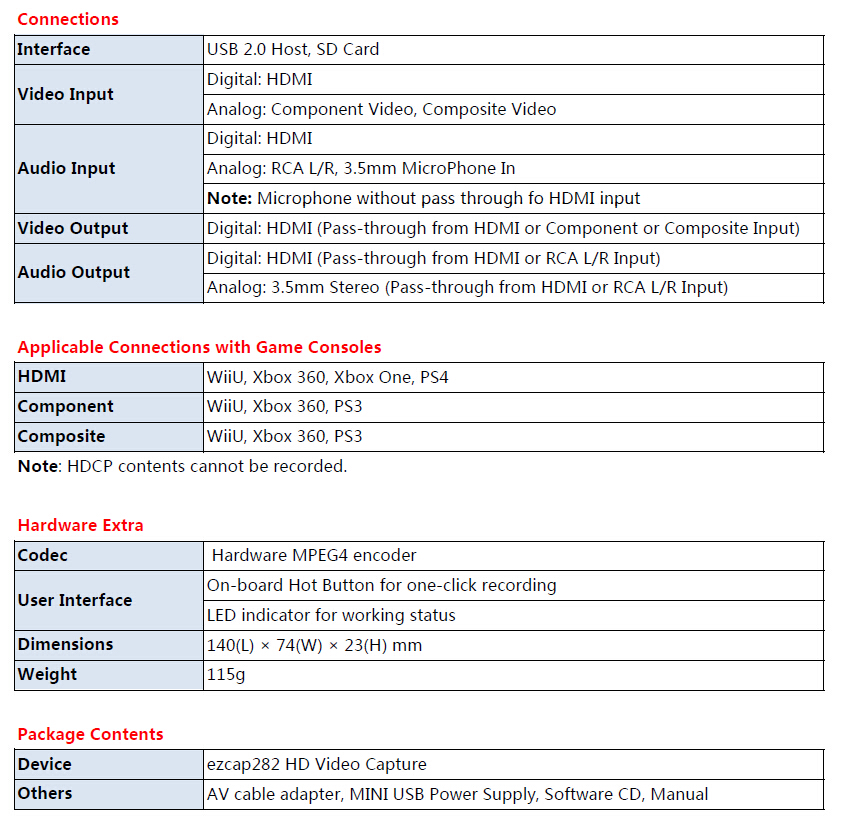 ezcap282 HD 1080P Video Capture provides the flexible connectivity with HDMI,Component and Composite inputs, which makes it applicable to all the mainstream gaming platforms, including Xbox 360 & One, PlayStation 3 & 4 Wii U. Even better, it's no PC enquired, Simply One click on the Record Button, 1080p recording is done right away.